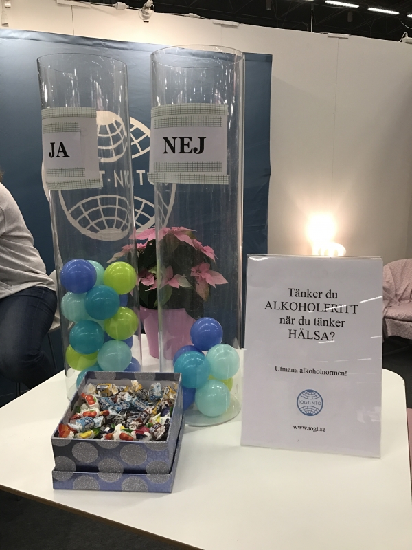 På ”Allt för Hälsan” passerade jag IOGT-NTO’s monter. Man kunde genom att placera färgade bollar i två rör svara på frågan; ”Tänker du ALKOHOLFRITT när du tänker HÄLSA?”.